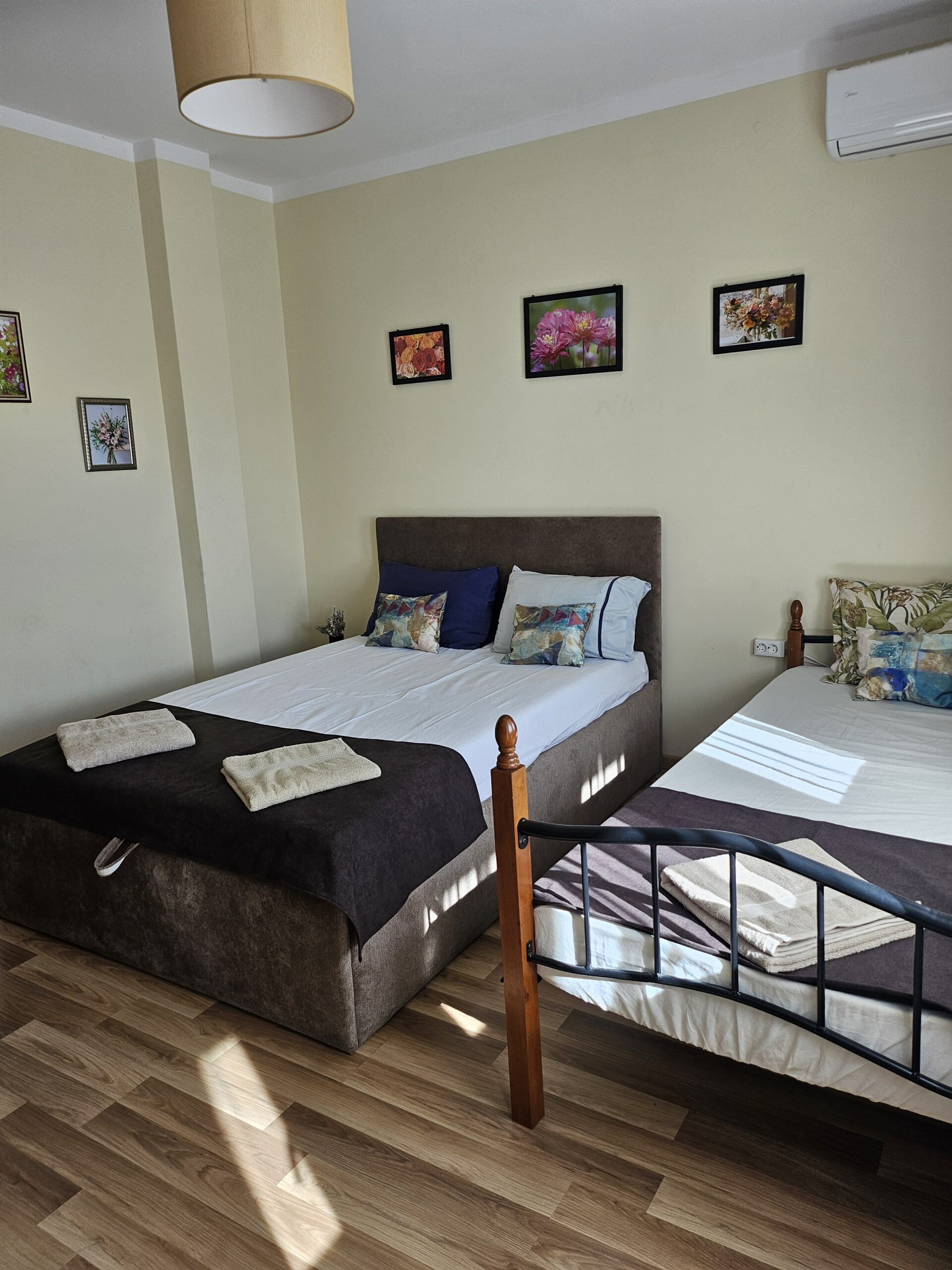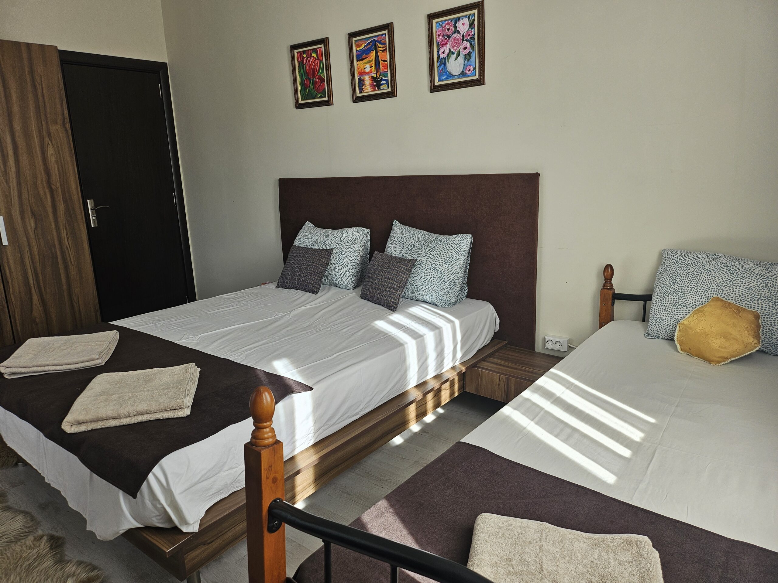 Къща София разполага с леглова база за настаняване на 10 човека – две тройни стаи/1 двойно легло+ 1 единично/ и две двойни стаи,едната от които се намира на първия етаж. На втория етаж се намират и двете бани. На първия етаж се помещава и трапезария и напълно оборудвана кухня.